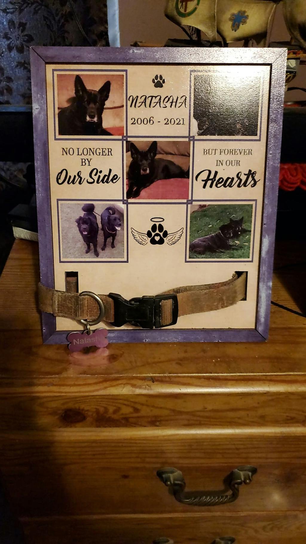 Pets are family and it’s heartbreaking when they cross the rainbow bridge. And dog’s, cat's collars in a memory box for years and we thought it was time to celebrate their lives and showcase their memories in a better way, so we created these pet memorial signs to showcase each of their individual collars, and be able to see them every day. These beautiful wooden signs are a sweet reminder that although they are gone, they are not forgotten. Each sign is individually handmade to celebrate your beloved pet's life and keep their memory alive.