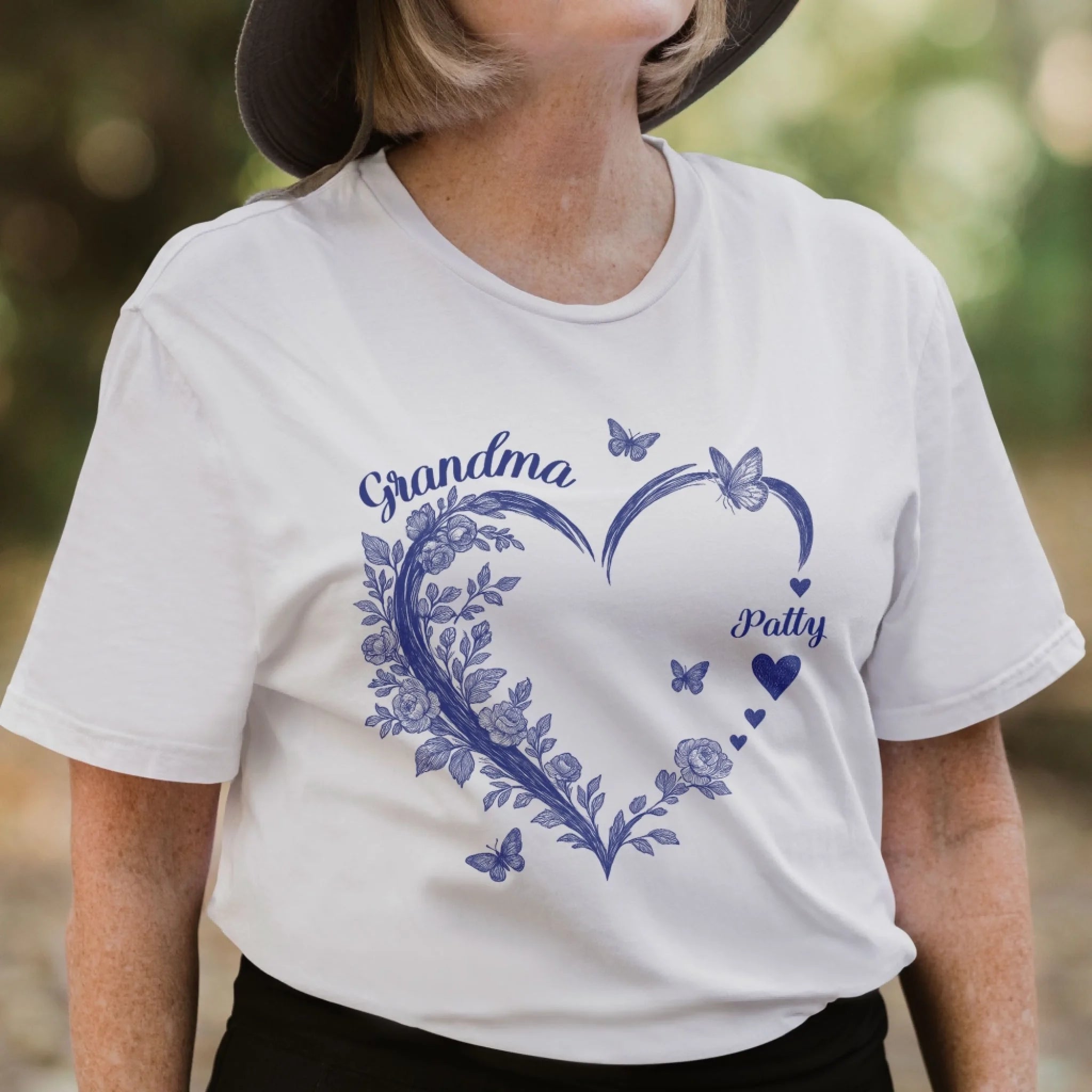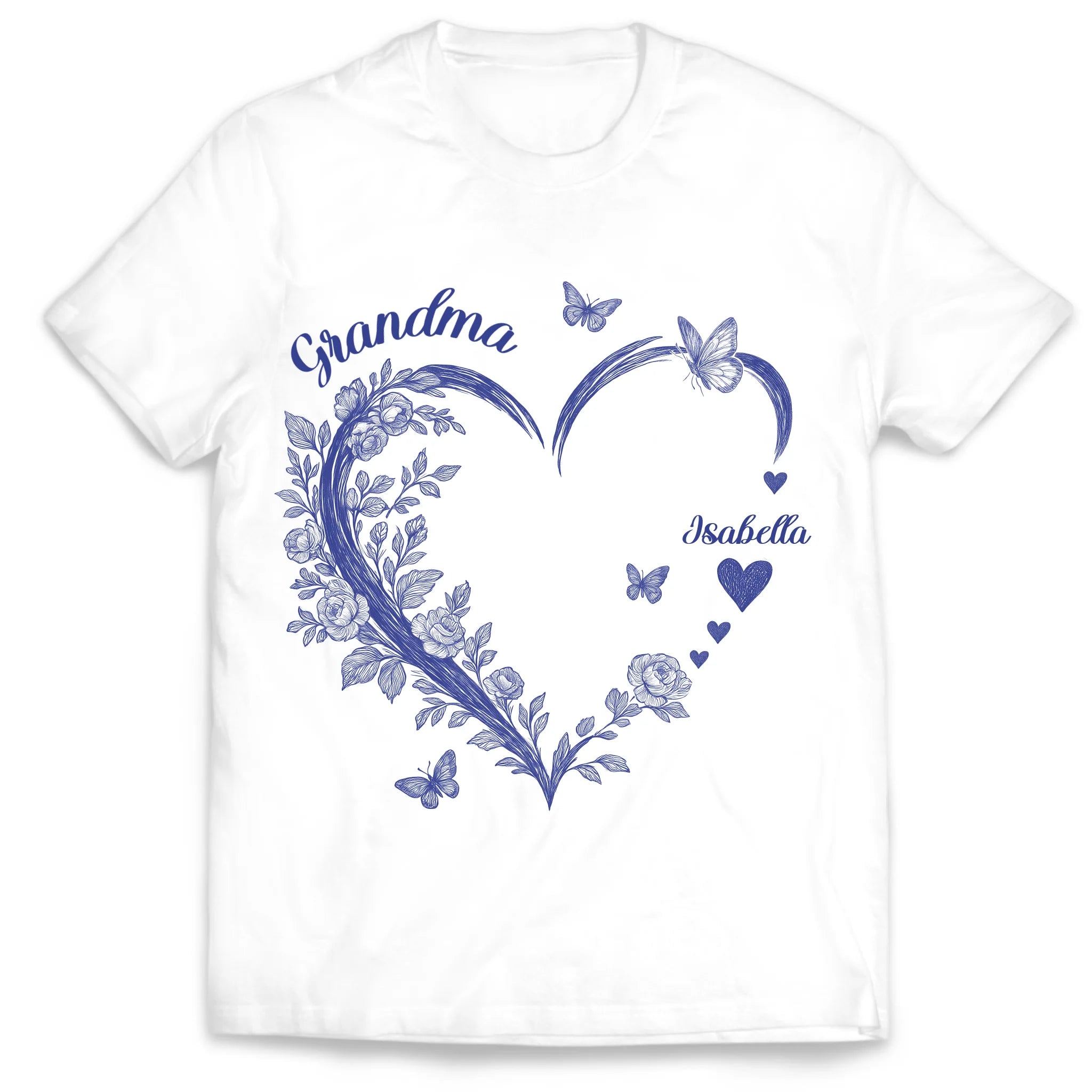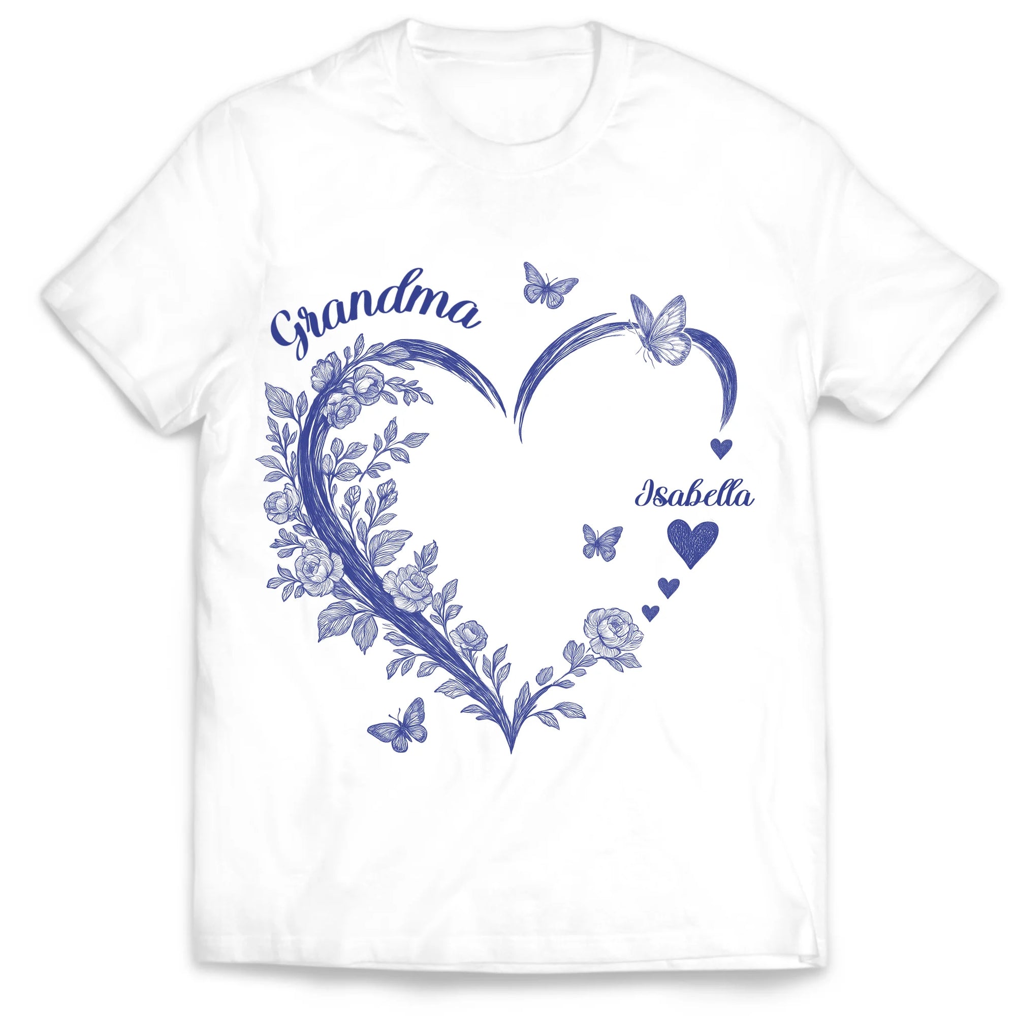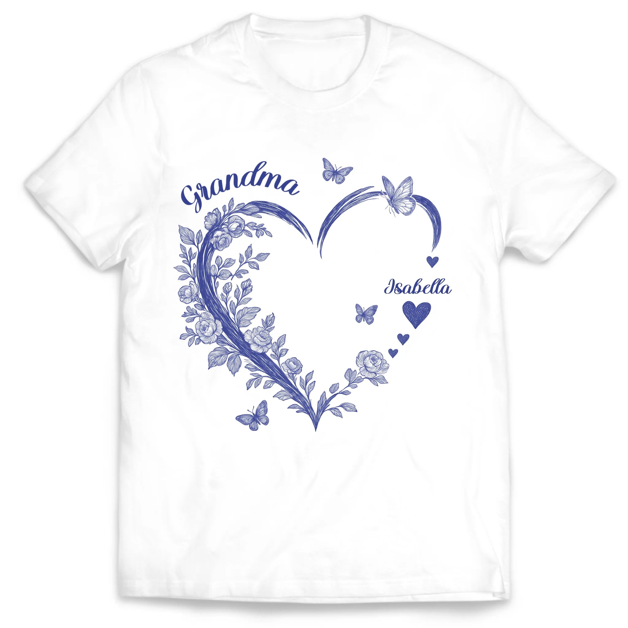 Grandma and Grandkids, Forever In Grandma's Heart - Personalized T-Shirt, Gift For Grandma, Blue Toile De Jouy Shirt