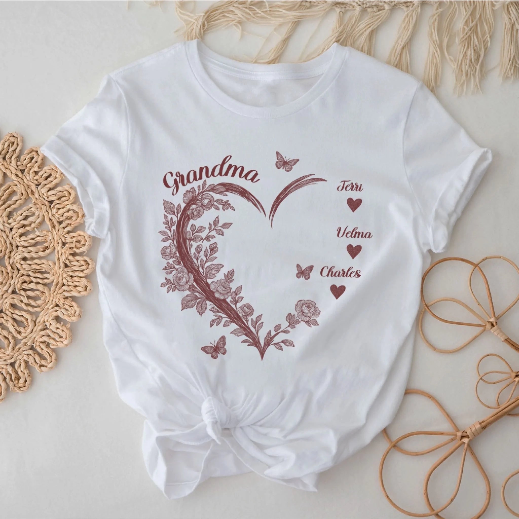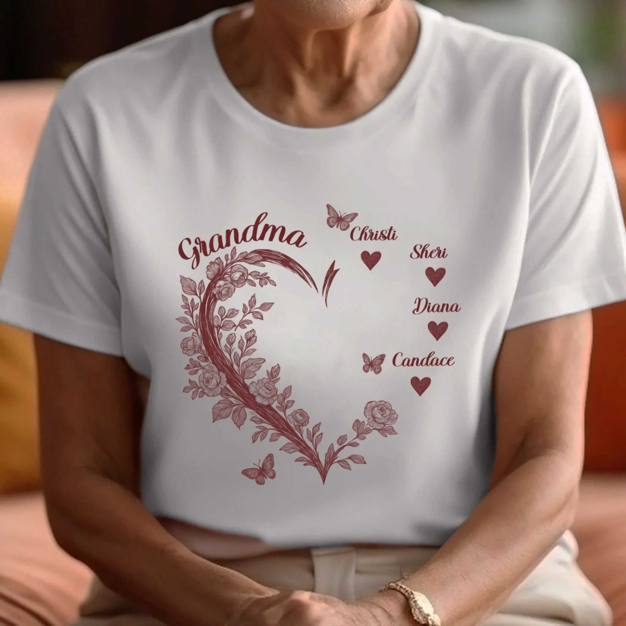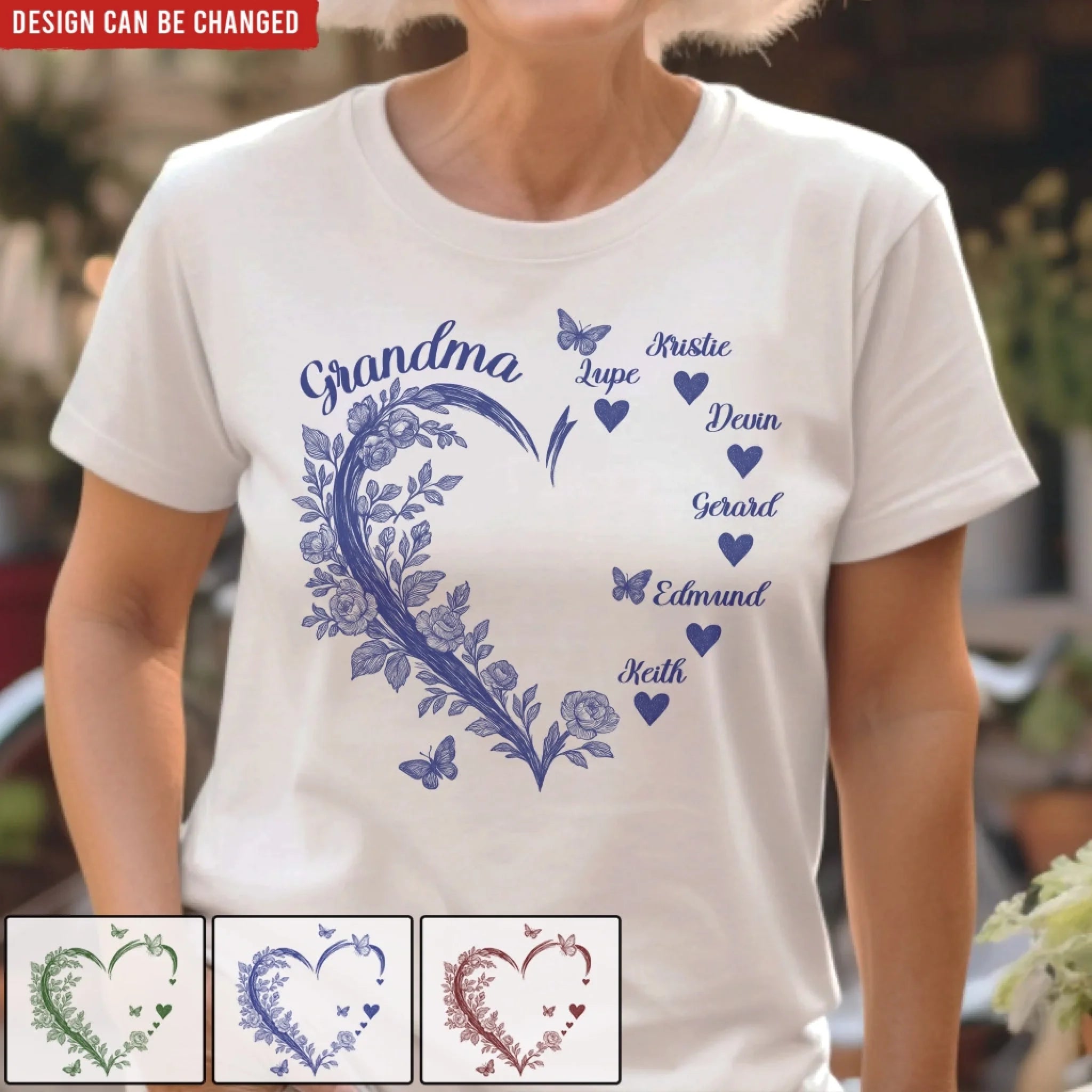 Grandma and Grandkids, Forever In Grandma's Heart - Personalized T-Shirt, Gift For Grandma, Blue Toile De Jouy Shirt