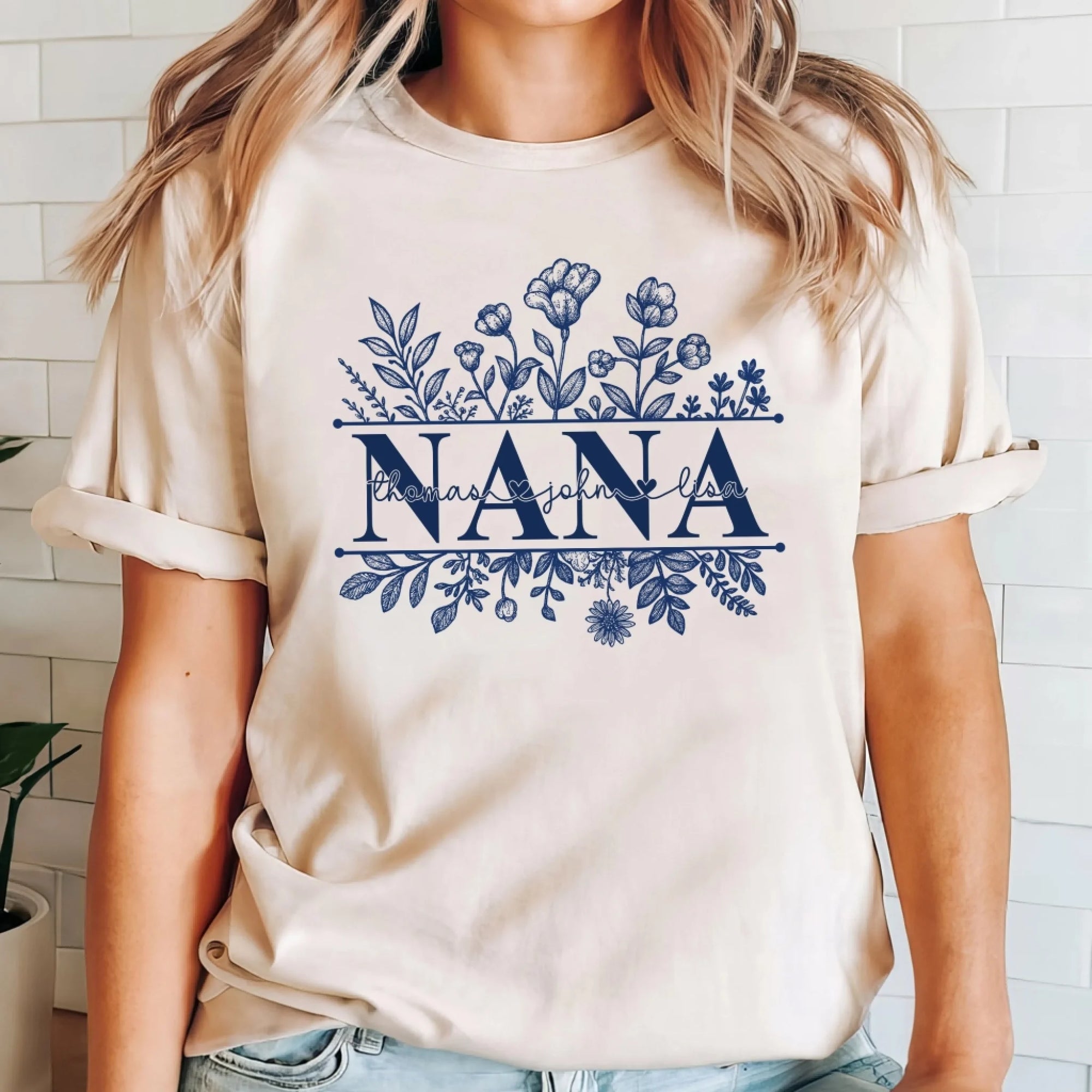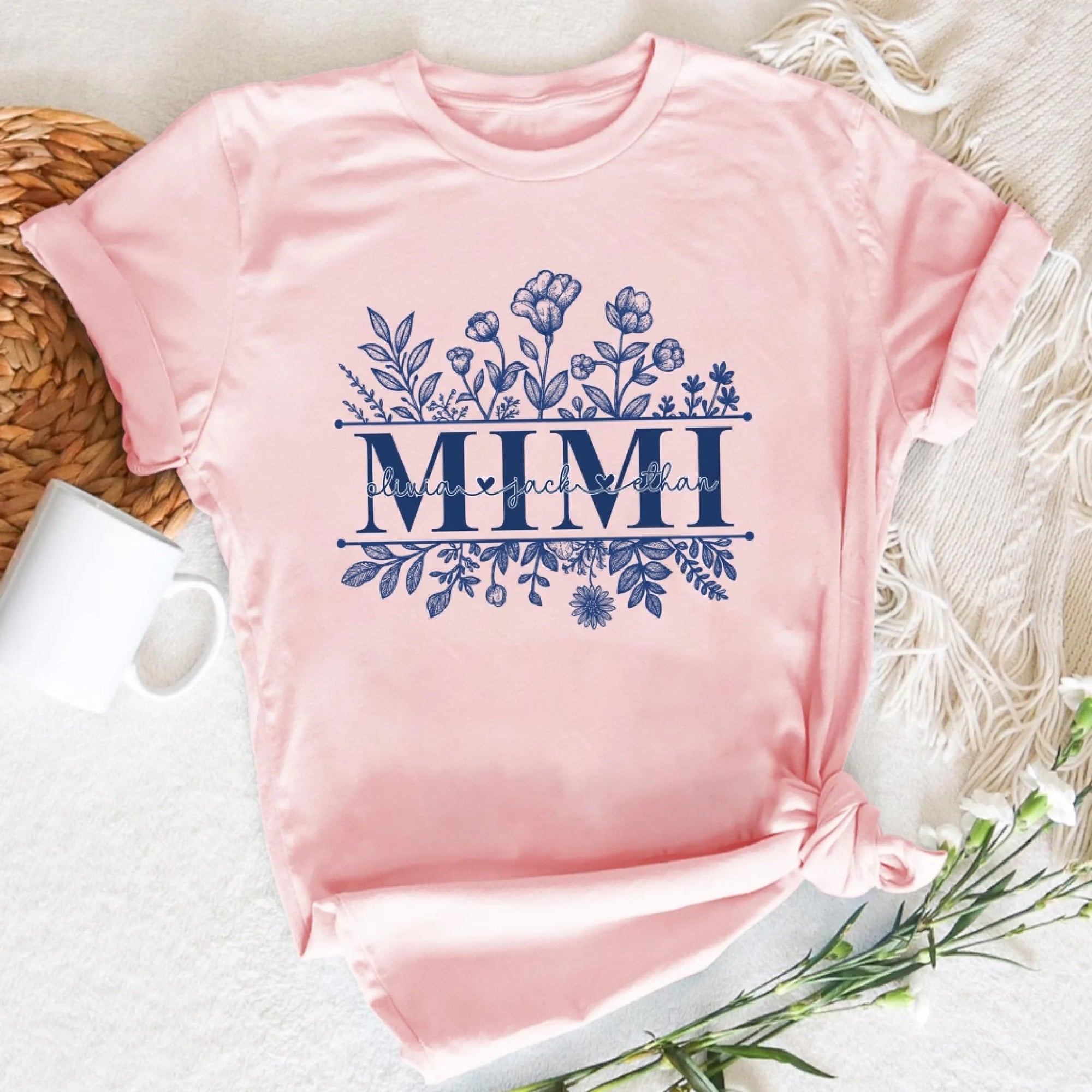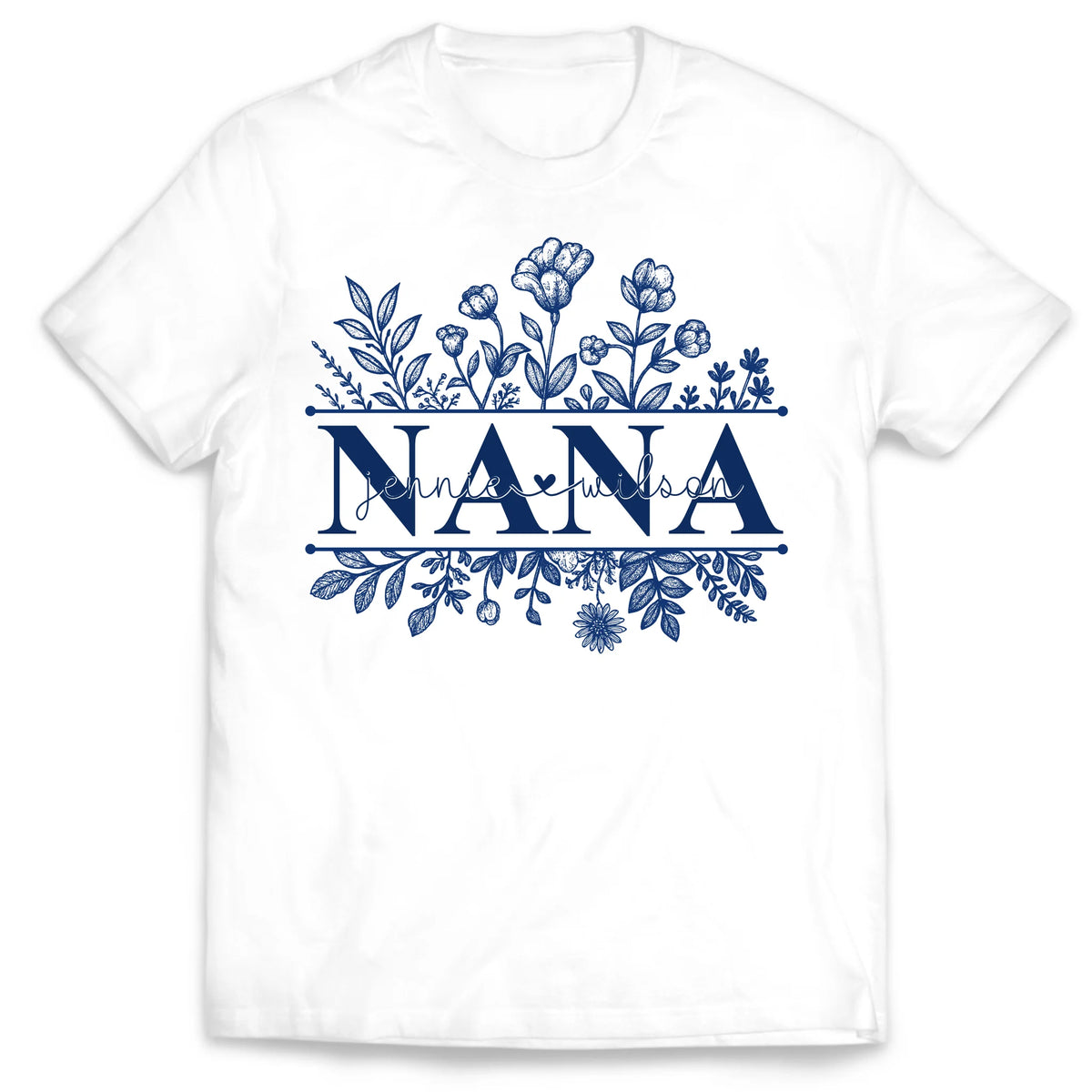 Wildflowers Grandma And Her Grandkids - Personalized T-Shirt, Gift For Grandma, Blue Toile De Jouy Wildflowers Gift