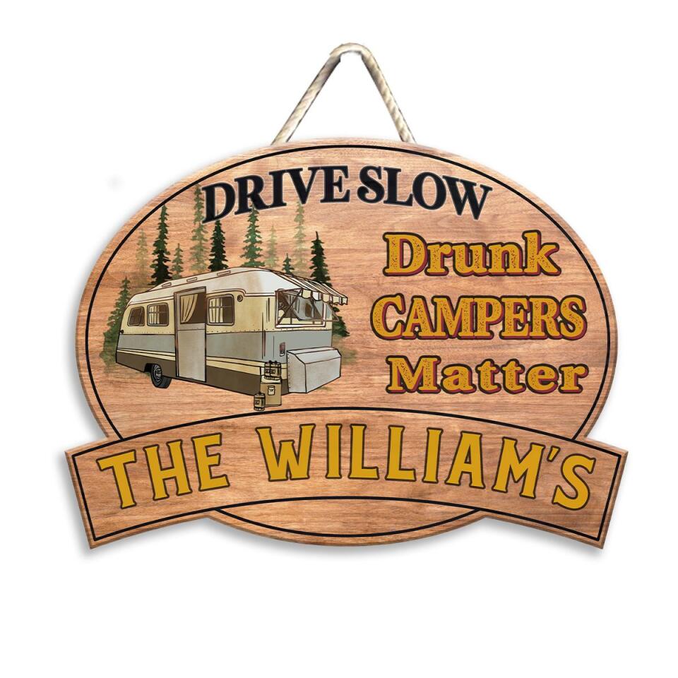 Drive Slow Drunk Campers Matter - Personalized Wooden Door Sign, Gift For Camper