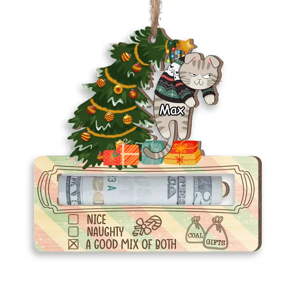 Cute Cat Christmas Tree On The Nice List - Personalized Wooden Ornament, Money Holder Ornament, Christmas Present - ORN271