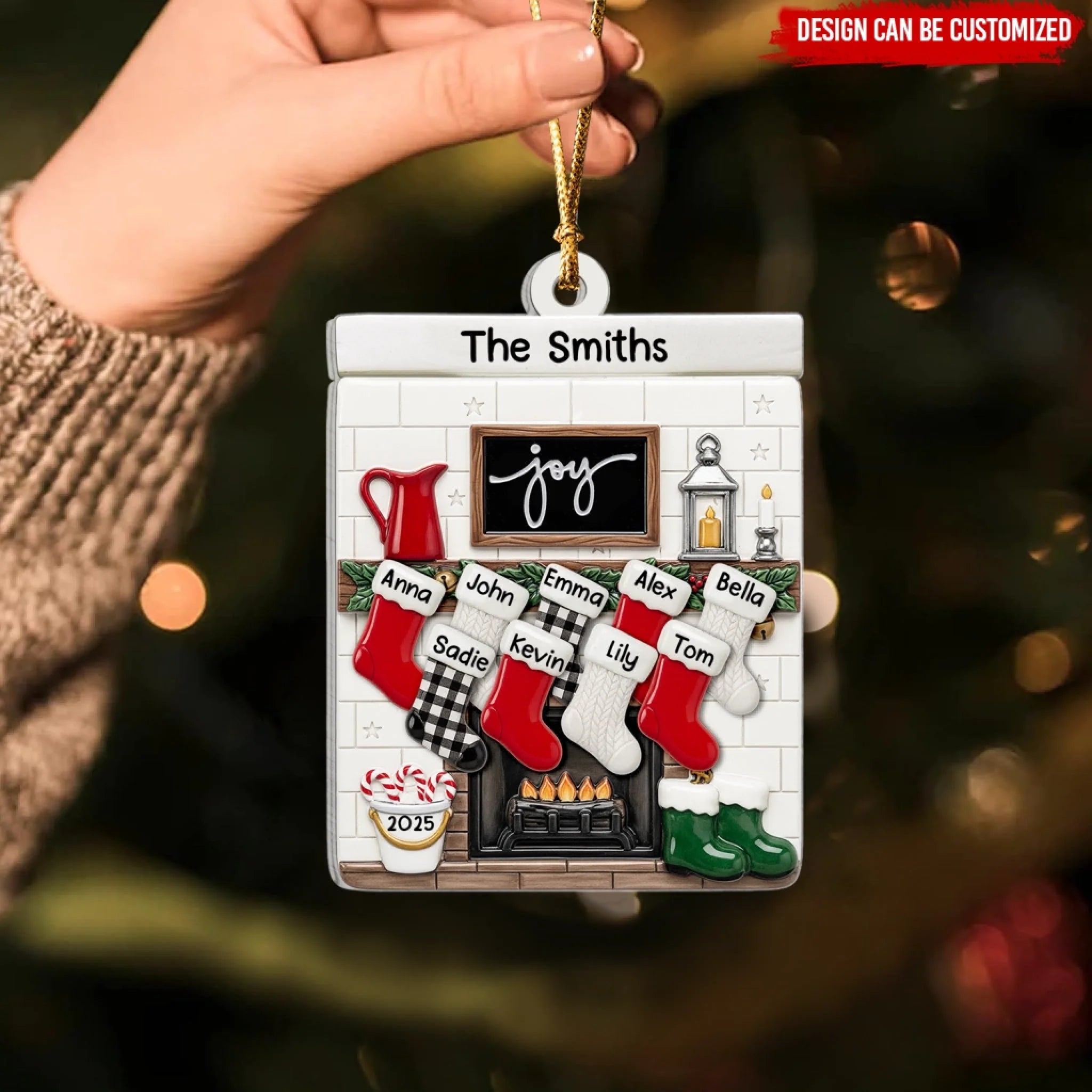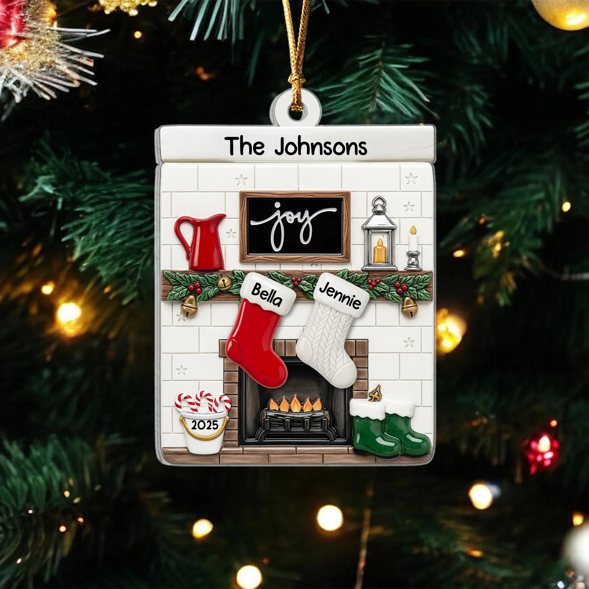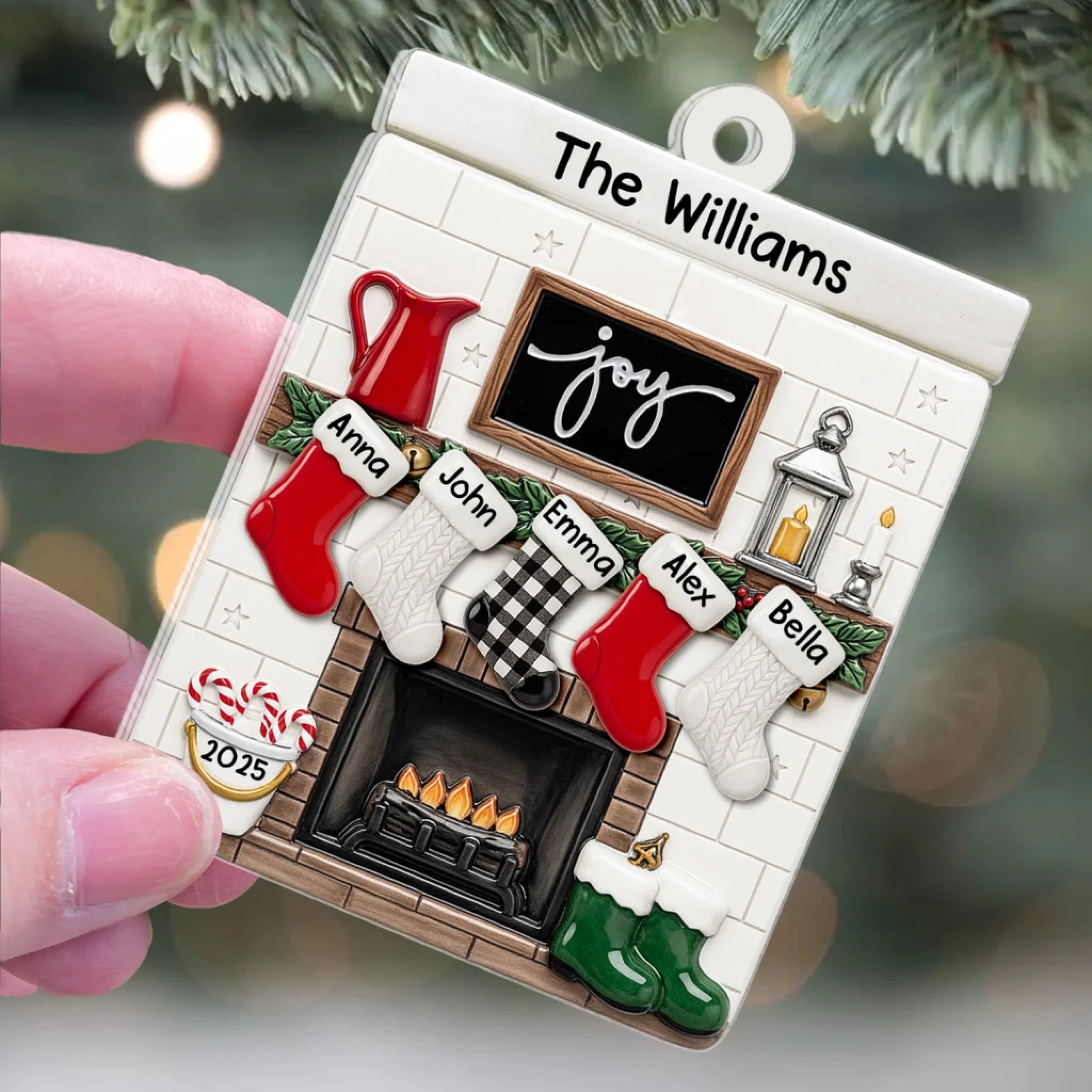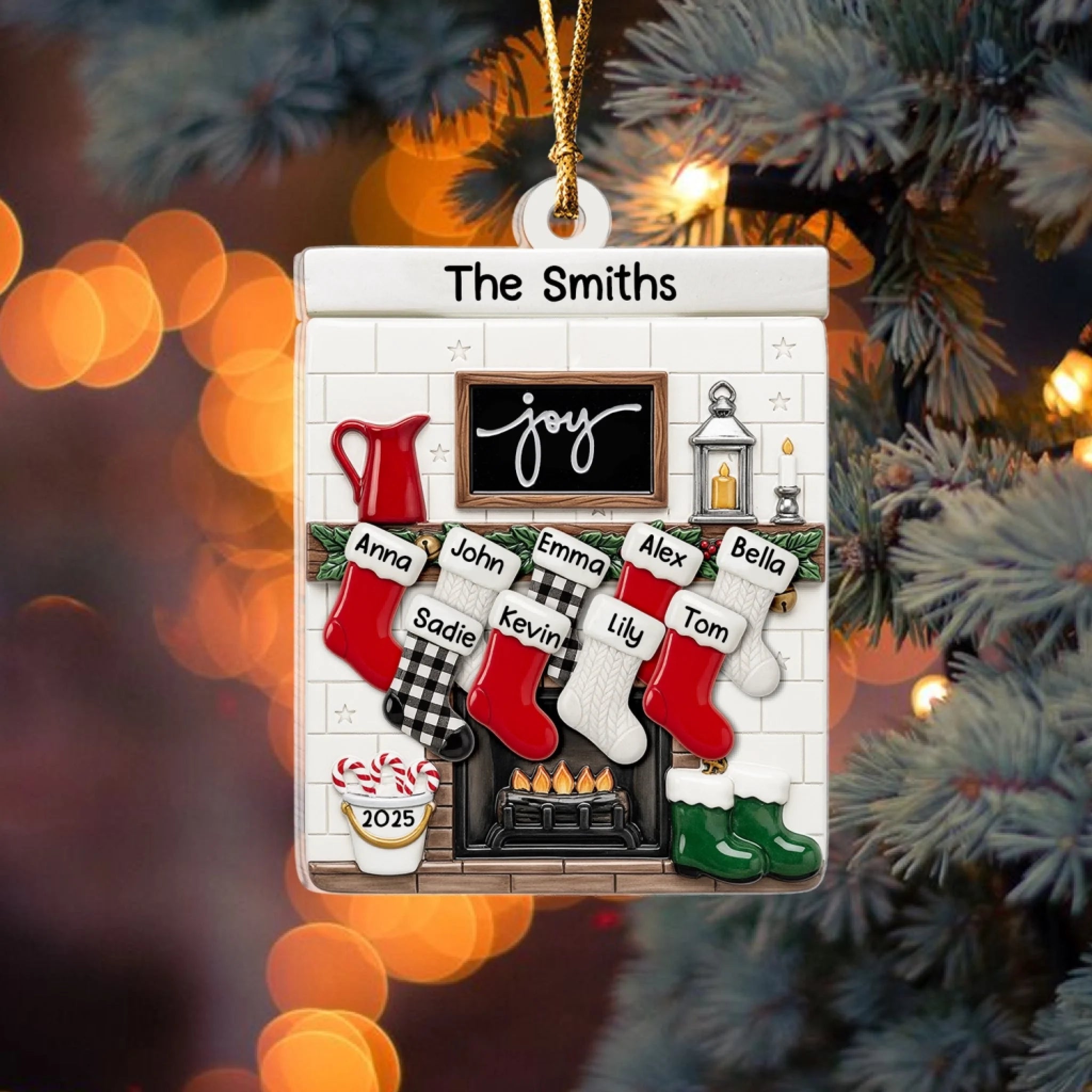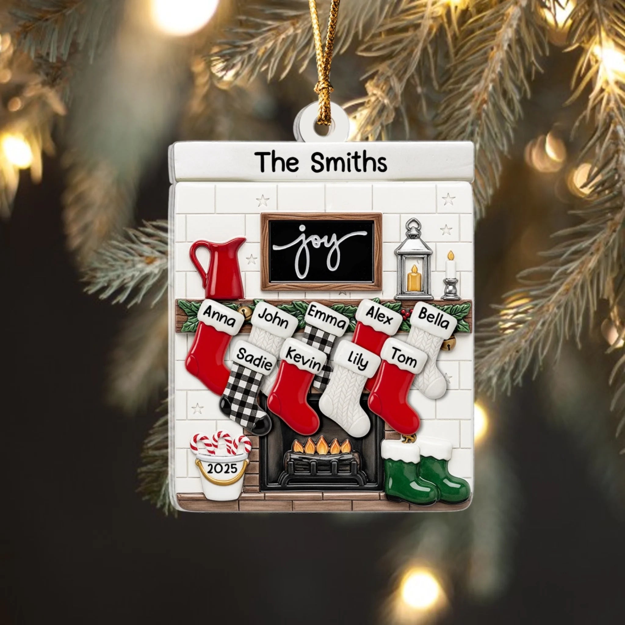 Fireplace Mantel Family Stocking Ornament - Personalized Ceramic Ornament, Family Gift, Christmas Decor