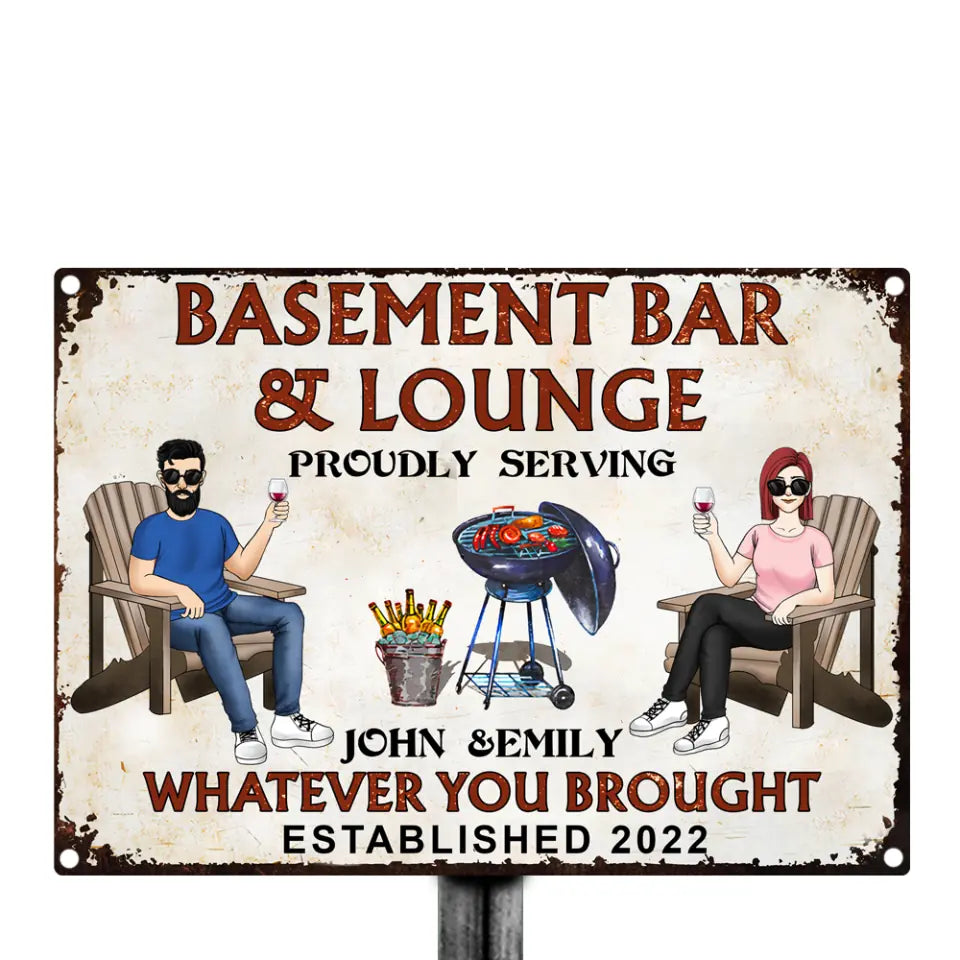 Basement Bar & Lounge Proudly serving Whatever you brought - Personalized Metal Sign