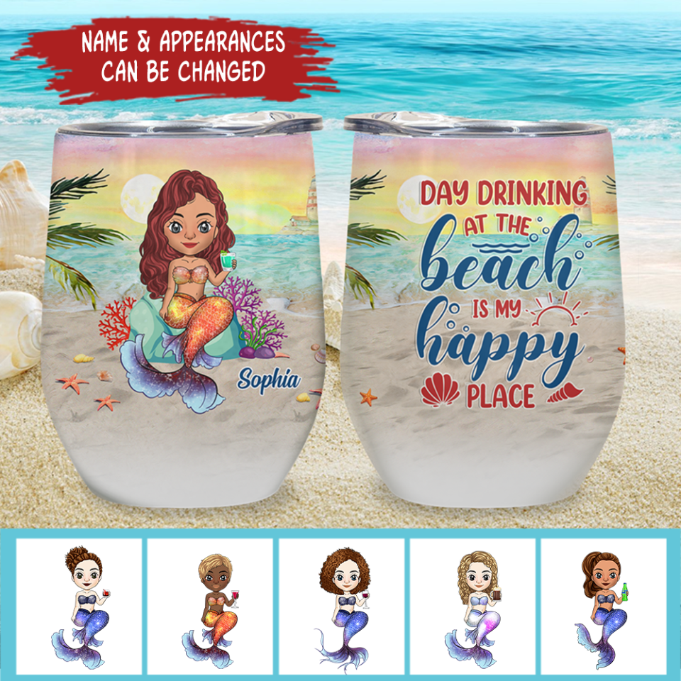 Day Drinking At The Beach Is My Happy Place Sunset - Personalized Wine Tumbler