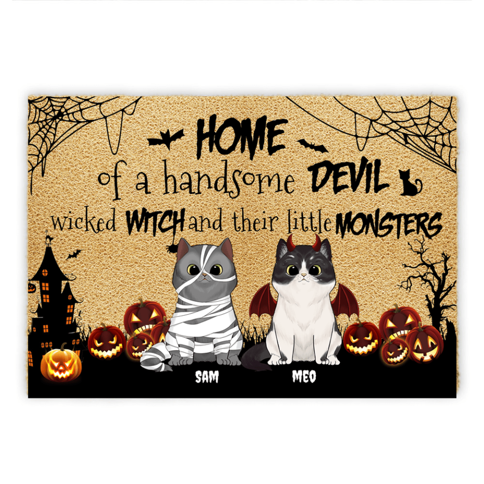 Home of a handsome devil, wicked witch and their little monsters - Personalized Door Mat