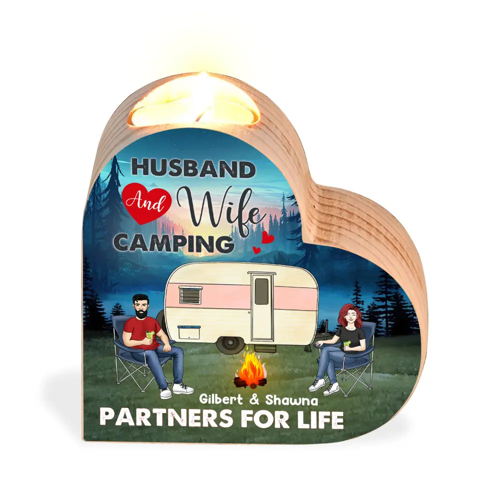 Husband And Wife Camping Partners For Life - Personalized Heart Shaped Candle Holder, Gift For Camping Lover