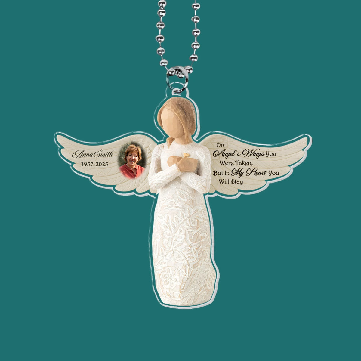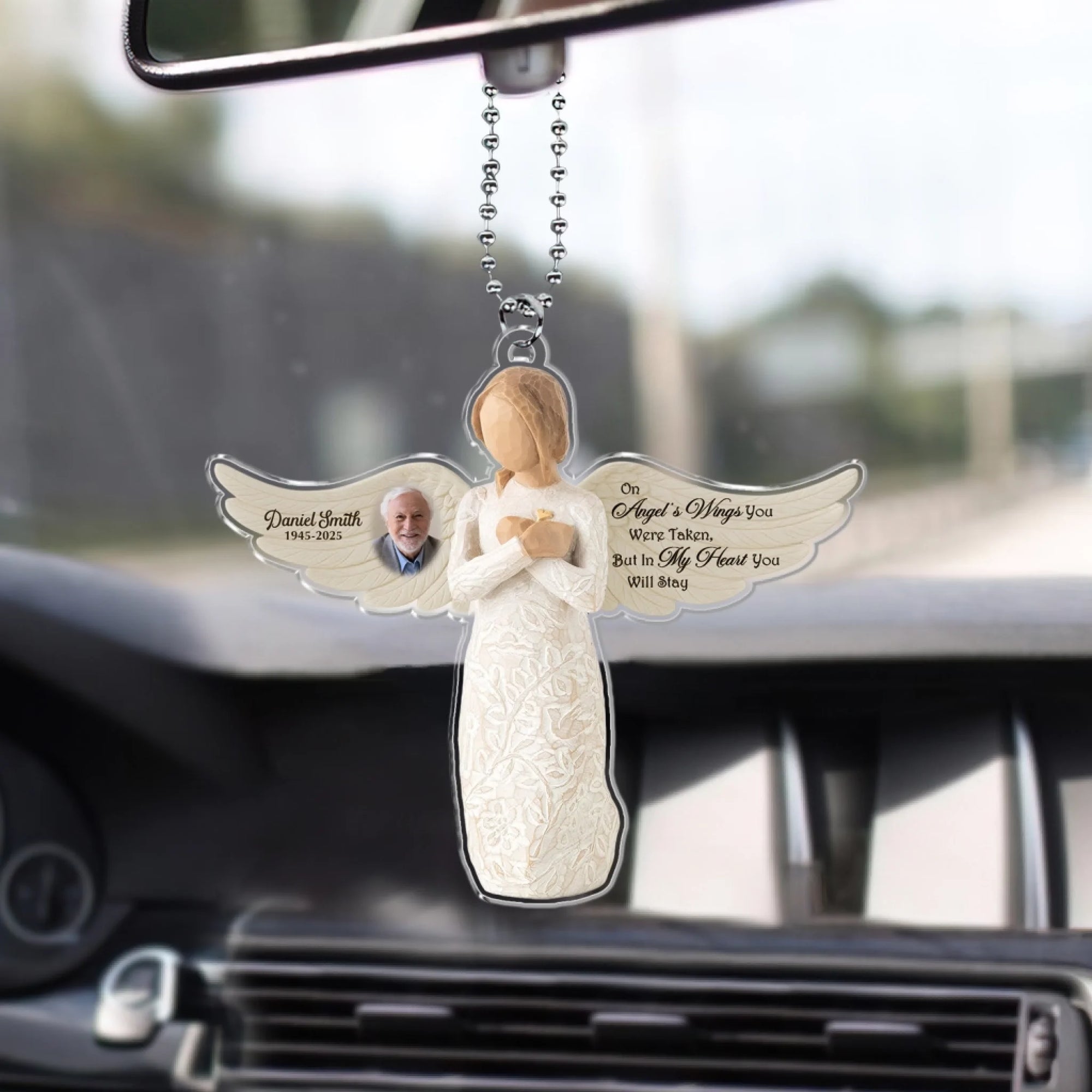On Angel's Wings You Were Taken, But In My Heart You Will Stay - Personalized Acrylic Car Hanger, Remembrance Angel, Memorial Gift