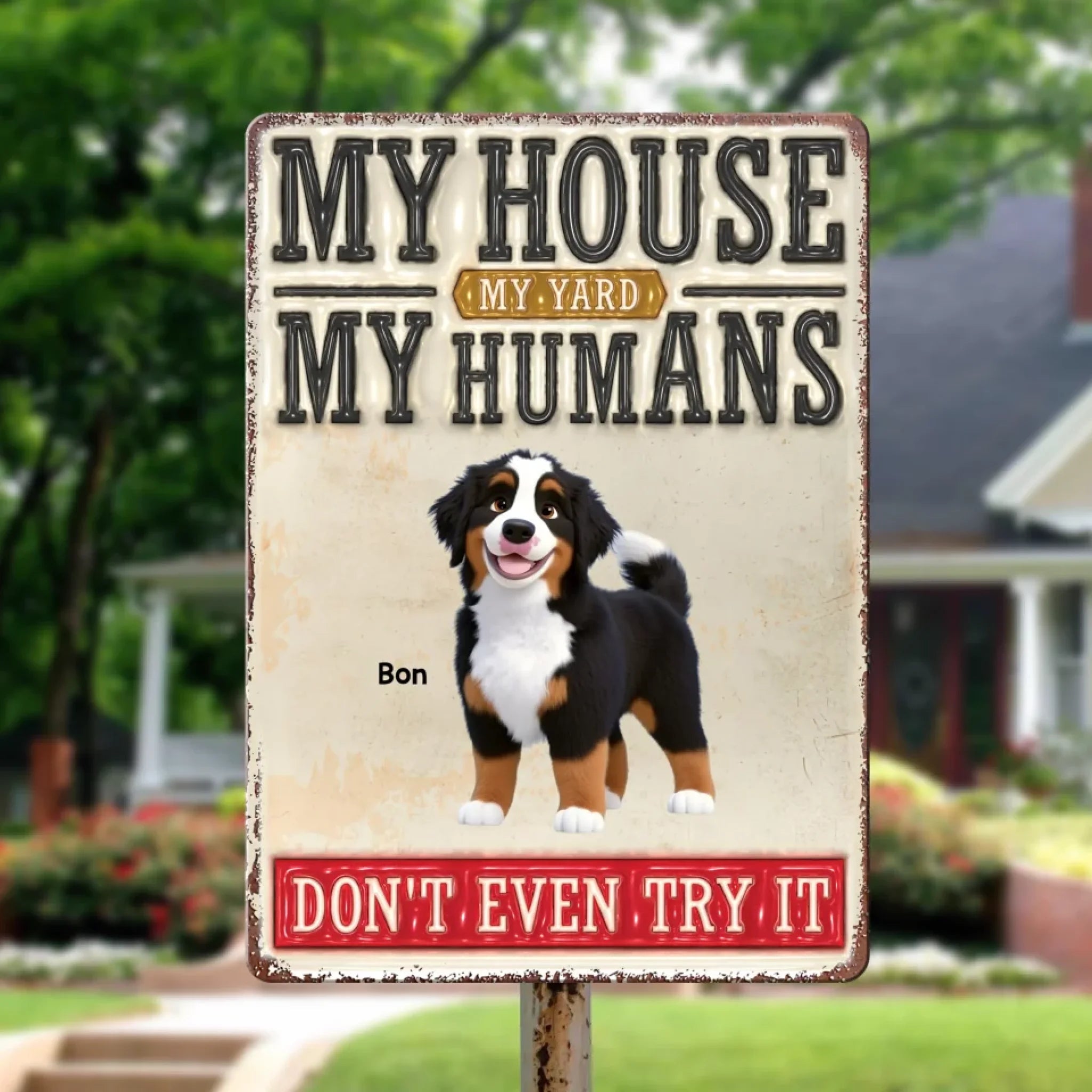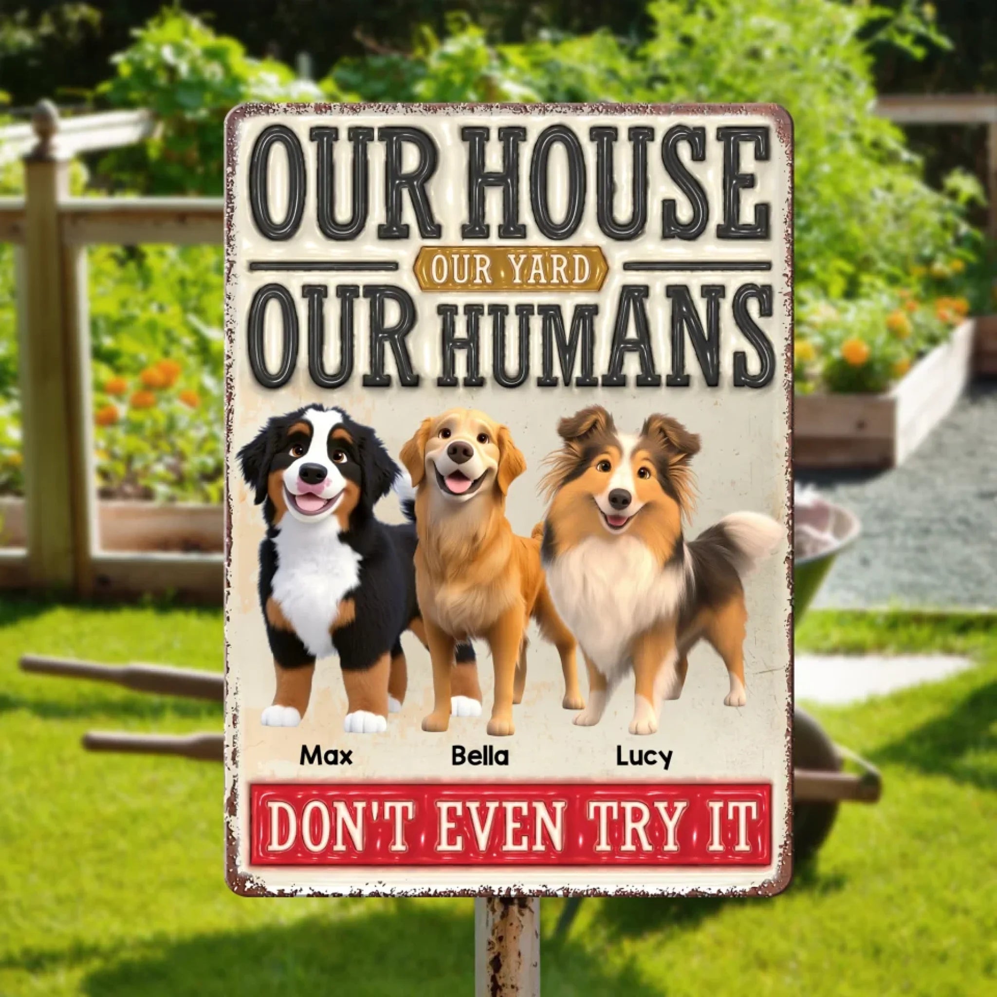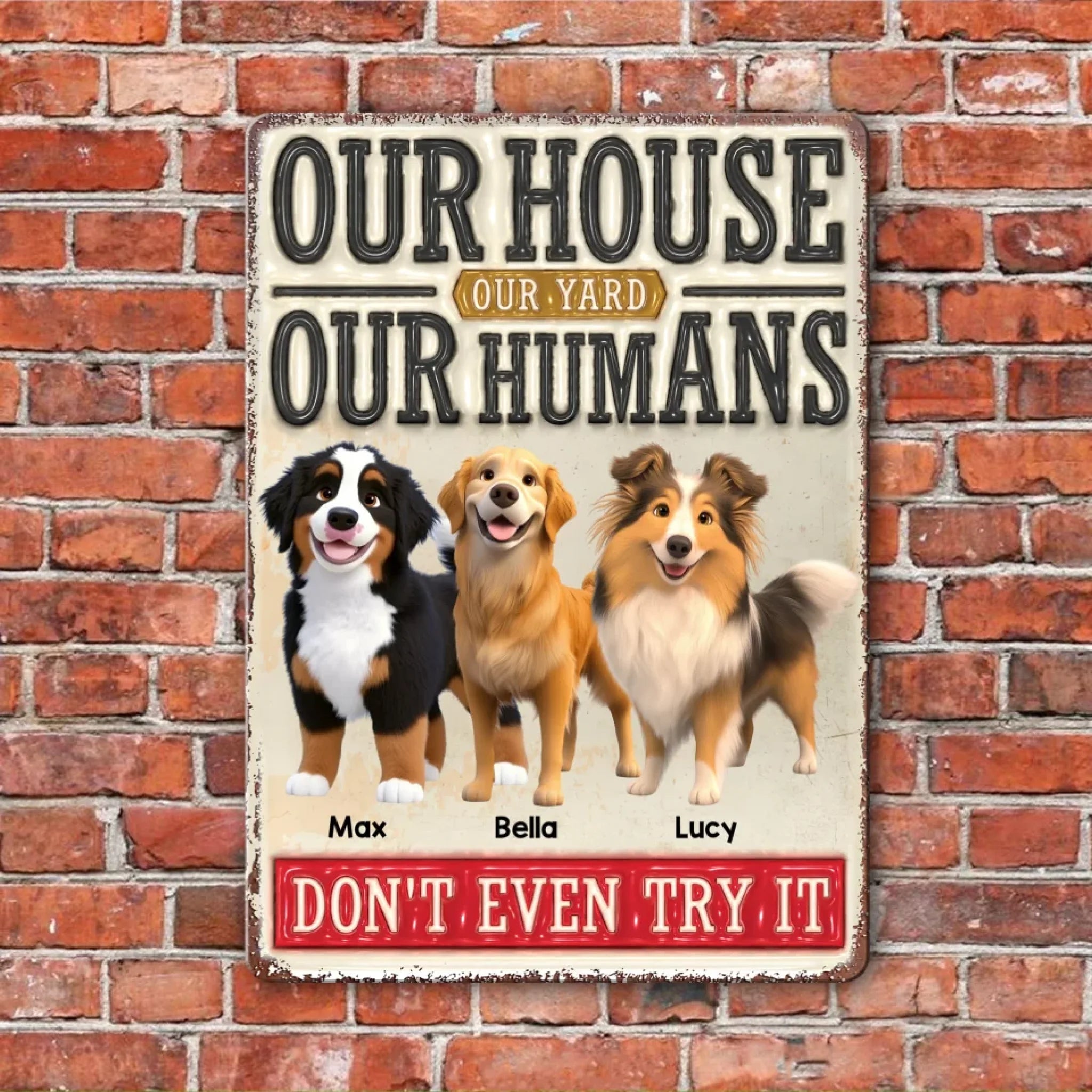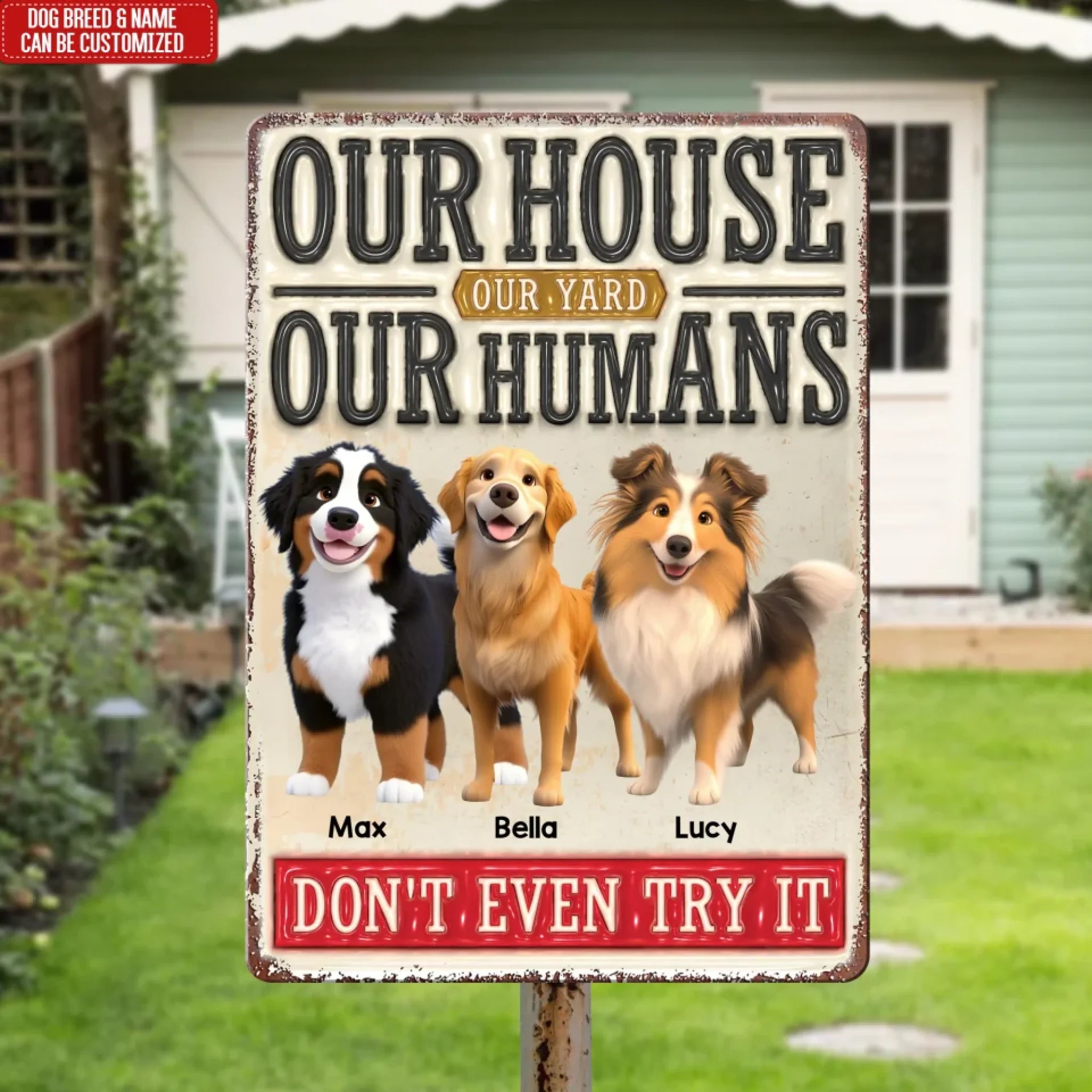 Our House Our Yard Our Humans Don't Even Try It - Personalized Metal Sign, Gift for Dog Lovers
