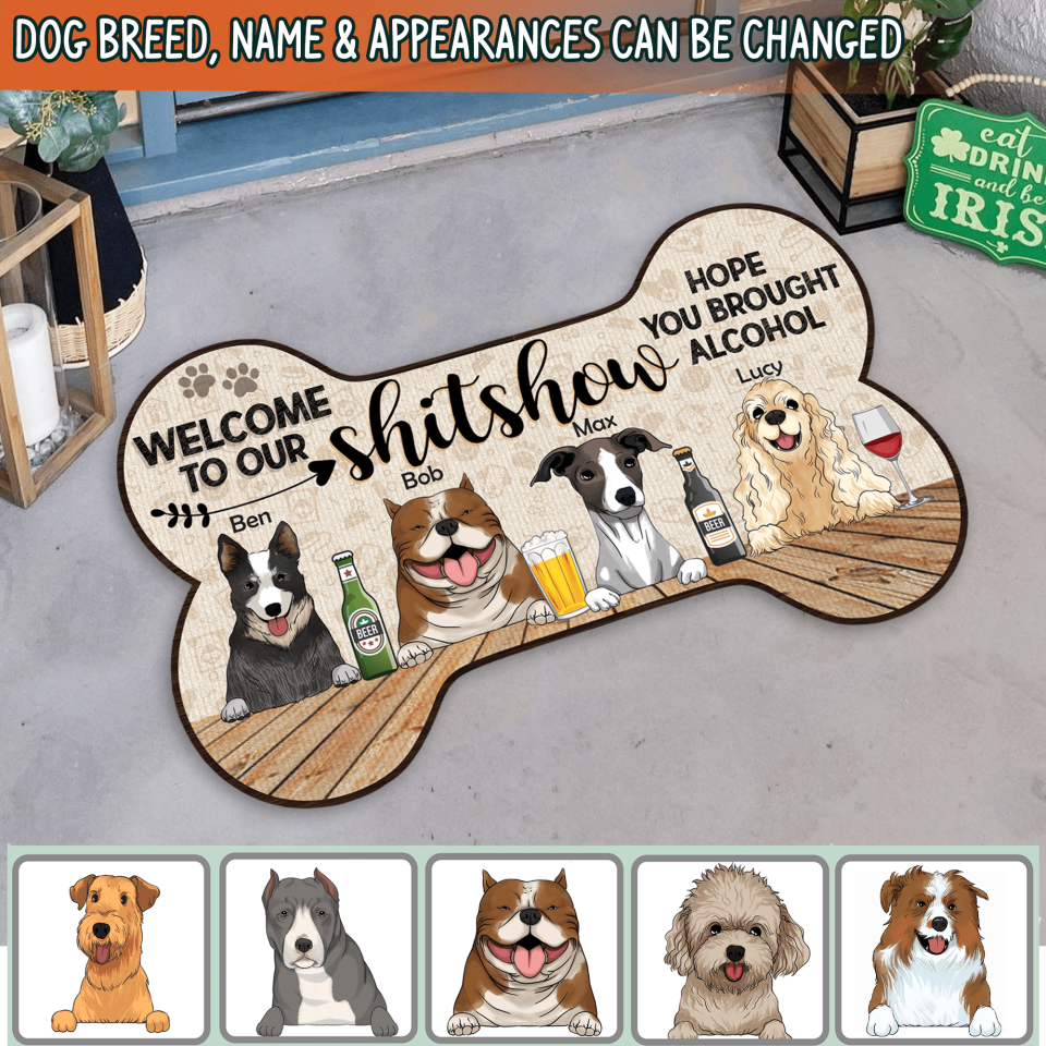 Welcome To Our Shitshow, Hope You Brought Alcohol - Personalized Bone Shaped Doormat